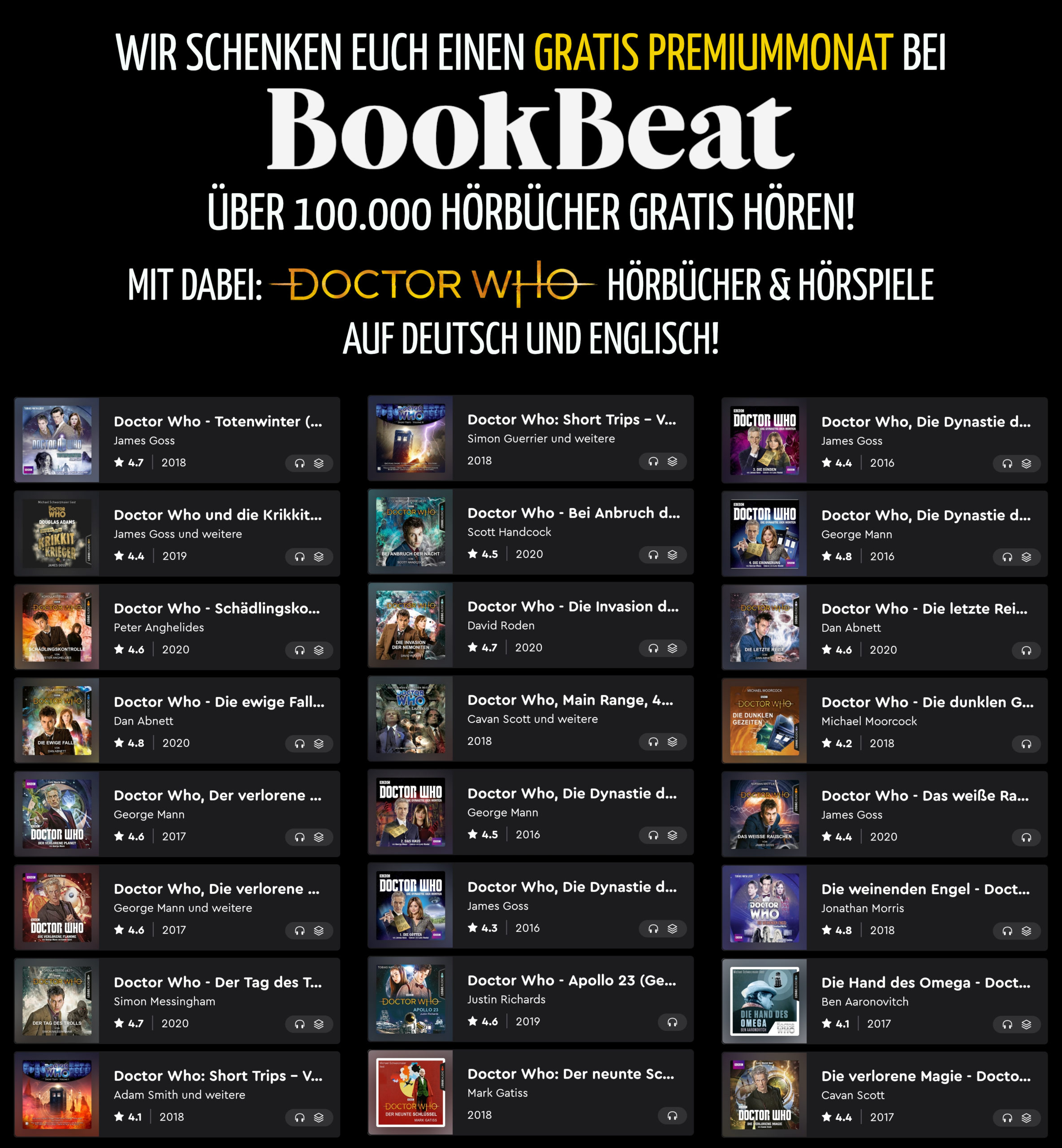 « News | Wir schenken euch einen Gratis Premiummonat bei BookBeat | Doctor Who Hörbücher & Hörspiele